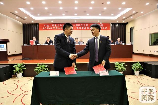 2019年1月,在中建二局2層會議廳內(nèi),石榮代表團(tuán)隊(duì)和公司簽訂《經(jīng)營業(yè)績責(zé)任書》。中建二局北京分公司供圖 千龍網(wǎng)發(fā)